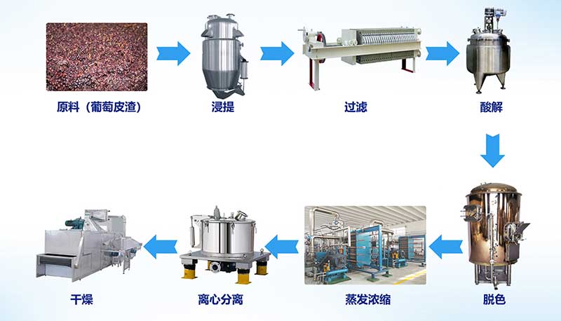 原料(葡萄皮渣)经过浓硫酸的浸提离心后,得到的皮渣进行烘干粉碎可加入饲料,向浸提液中加入碳酸钙调PH为7.0,得到就是酸石酸钙沉淀,溶液中含酒石酸钾成分,将上清液转移至另一容器充分搅拌下加入氧化钙,将酒石酸钾全部转换为酒石酸钙.然后用浓硫酸解酒石酸钙得到酒石酸和硫酸钙沉淀。离心分离后用活性炭脱色,再浓缩结晶烘干得到纯酒石酸。