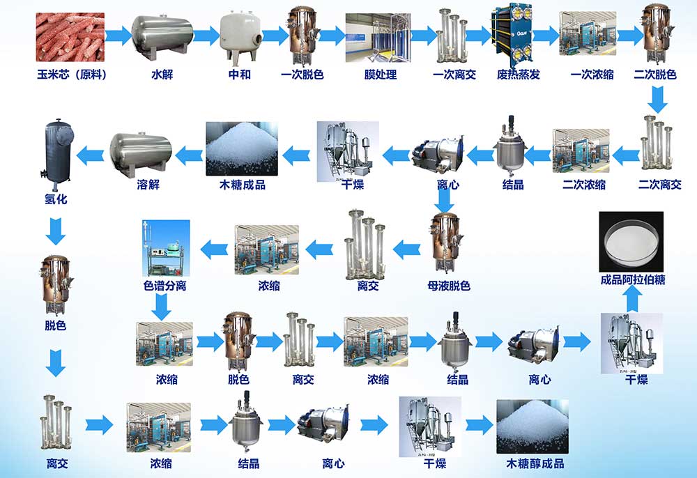 首先,无杂质,无霉变的玉米芯清洗,干燥,进入粉碎机打碎,之后被打碎的玉米粉进入处理罐,加入清水过滤,得到滤渣。滤渣进入水解罐,加入硫酸,搅拌,加热,保温水解。水解液进入中和罐,加入碳酸钙悬浮液,调节PH至3.6左右。进入一次脱色罐和5%的活性炭混合,保温搅拌,最后趁热过滤,得到稀木糖溶液。木糖稀溶液通过离子交换除去滤液中的金属离子、离子型色素以及残留的可溶性含氮物等杂质,可进一步提高糖液的纯度和热稳定性,使其无色透明。无色透明木糖溶液下一步进入一次板式蒸发装置或者列管蒸发装置进行蒸发浓缩,利用水解产生的废热作为加热蒸汽。浓缩后的木糖溶液进入二次脱色罐进一步脱色,接着进入二次离子交换柱,除去金属离子。除杂后的木糖溶液便可进入二次蒸发浓缩系统进一步提高浓度至接近饱和。然后进入结晶器结晶,利用离心机将结晶后的木糖分离。得到木糖成品。木糖成品有两个用途,第一个是干燥的木糖晶体通过工序溶解,加氢,脱色,离交,浓缩,结晶,离心,干燥,便可以得到木糖醇成品。第二个是离心后的木糖晶体用母液溶解,溶解后的木糖溶液重复脱色,离交,浓缩,色谱分离得到阿拉伯糖提余液。色谱分离是基于不同物质在由固定相和流动相构成的体系中具有不同的分配系数,在采用流动相洗脱过程中呈现不同保留时间,从而实现分离。分离得到的阿拉伯糖提余液重复浓缩,脱色,离交,浓缩,结晶,离心干燥等工序,最终得到阿拉伯糖成品。以上便是木糖,阿拉伯糖,木糖醇联产工序。