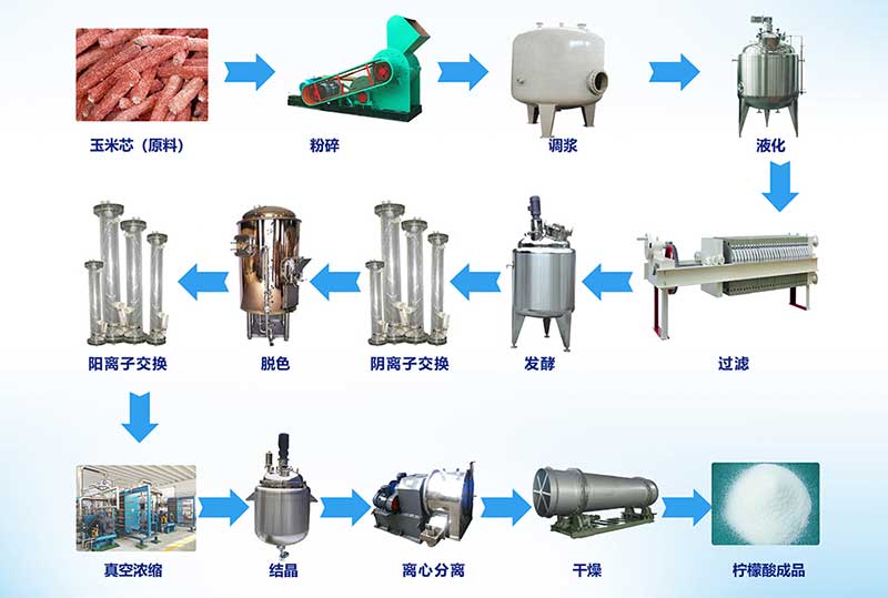 首先将原料玉米除杂后进行粉碎, 60 目过筛得合格的玉米粉。向调浆罐通过物料输送机输送玉米粉;按质量比(玉米粉:水)为 1 : 4.5的比例加入65℃的水,利用碱性盐NA2CO3 溶液调节浆料 PH在 5.0~7.0 范围内,并加入0.1%氯化钙,作为淀粉酶的保护剂和激活剂。浆液打入液化罐,液化 30 分钟,升温杀死耐高温淀粉酶。液化液过滤除去玉米渣得到液化清液,降温。然后进入发酵罐,加入0.9%尿素,0.1%KH3PO4 , 0.25%MGSO4和10%种子液发酵。发酵液依次进入阴离子交换柱,阳离子交换柱,改变交换柱内压力将其他杂志去除。除杂后进入脱色罐,加入活性炭,脱色得到清液。清液进入蒸发浓缩装置,板式蒸发器或者列管蒸发器,为了节省能源消耗可以采用 MVR 或者 TVR 系统。最终得到高浓度柠檬酸清液。最后,高浓度柠檬酸液再进入结晶罐结晶,采用离心机分离,结晶固体通过干燥机干燥,最后得到工业化柠檬酸固体。