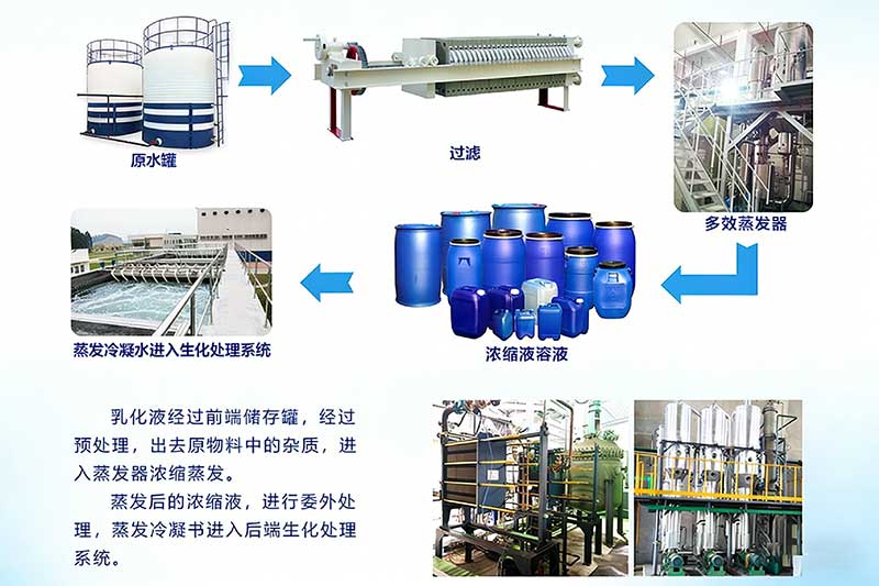 乳化液是一成分比较复杂的高浓度废水,其中含有乳化液、冷却液、切削剂、皂液、金属削等杂质。目前多采用预处理+蒸发(多效/MVR系统)+后端生化处理工艺。